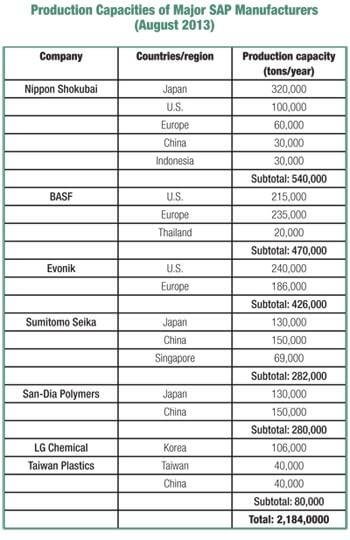 La Tabla 1 muestra la capacidad de producción de los mayores productores mundiales de polímeros superabsorbentes . La producción total de siete empresas de la lista asciende a casi 2,2 millones de toneladas en agosto de 2013. A pesar del aumento del 14,2 % en la capacidad en abril de 2012, la demanda de SAP supera la oferta a nivel mundial.